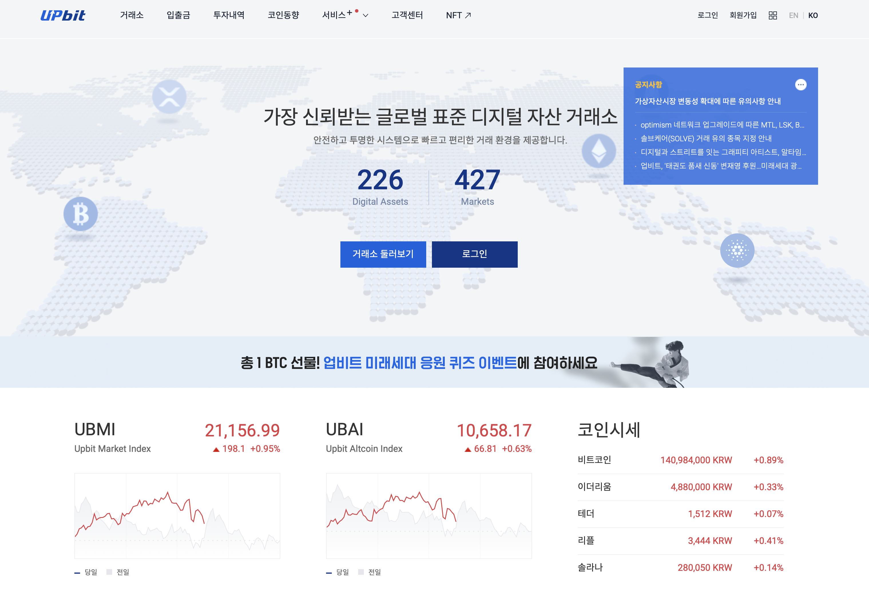 - 주소창에 https://www.upbit.com/ 입력 후 접속합니다.